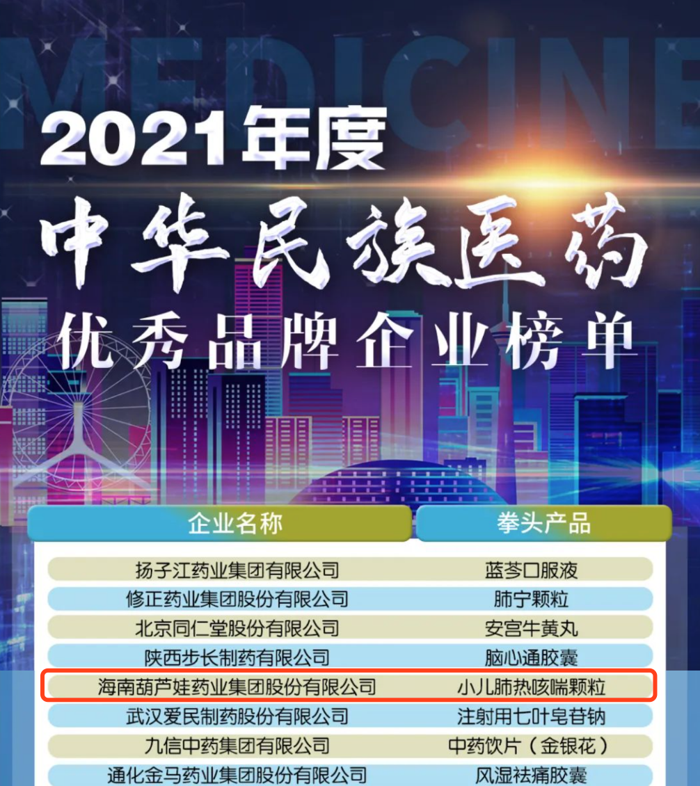 12月29日,全国工商联医药业商会发布了“2021年度中华民族医药优秀品牌企业榜单”,918博天堂药业集团凭借黄金单品小儿肺热咳喘颗粒(4克)实力登榜。